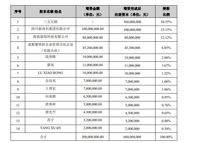 为提升天津通讯资本实力,支持其抓住机遇做大做强光伏新能源业务。三五互联表示,公司拟以现金方式对天津通讯增资2.72亿元。此外,天津通讯拟以增资前估值3.6亿元增资扩股引入13名战略投资者,由上述战投以货币方式向天津通讯增资3亿元,合计获得天津通讯增资后45.45%股权。增资扩股交易完成后,天津通讯的注册资本将由3.6亿元增至6.6亿元,三五互联对天津通讯的持股比例将由100%稀释至54.55%。