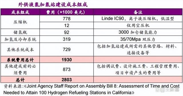 加州能源局研究数据显示,外供液氢加氢站建成所需的与设备相关的费用约为193万美元,考虑到还需要调试、工程设计成本、管理成本、施工成本等诸多成本,总成本约280万美元。