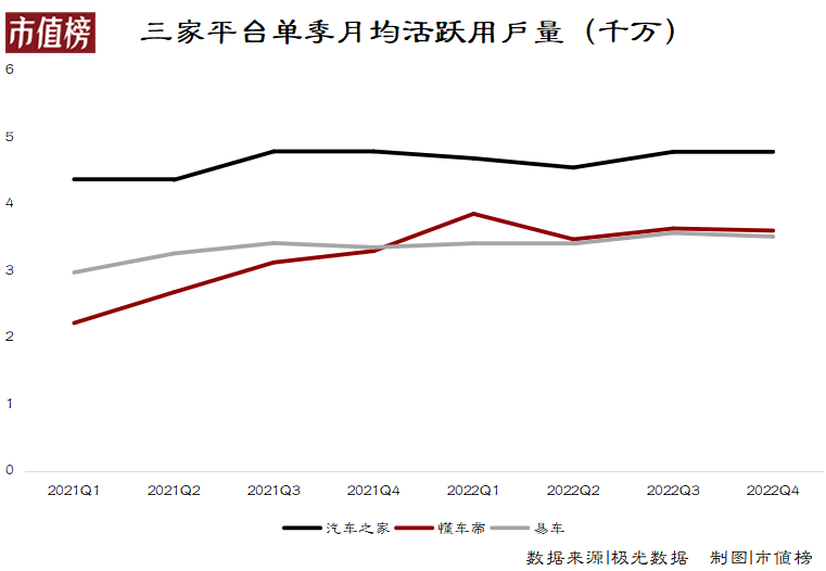 极光数据显示,2022年Q4汽车之家、懂车帝、易车的月均活跃用户量分别为4774万、3601万和3511万(不包括旗下易车报价大全),而在2021年Q1时,懂车帝的月活只有汽车之家的一半。