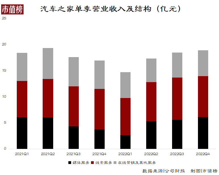 线索服务是汽车之家目前收入占比最大的业务,收入通常较为稳定,2022年为30.57亿元,同比增长2.3%,这也是2019年后首次同比正向增长。