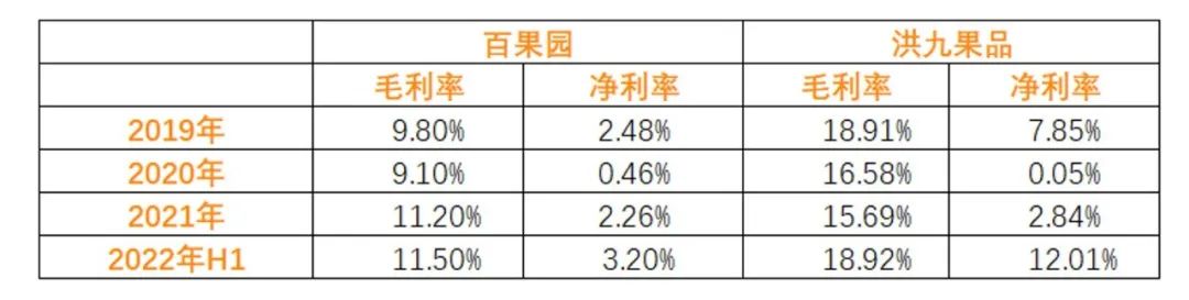 反映在数据上,2019年-2021年,百果园毛利率分别为9.8%、9.1%和11.2%,净利率分别为2.8%、0.5%和2.2%;洪九果品毛利率分别为18.91%、16.58%和15.69%,净利率分别为7.85%、0.05%和2.84%。