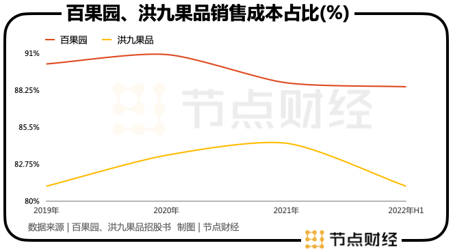 同期,洪九果品的销售成本占总营收分别为81.1%、83.4%、84.3%和86.51%。