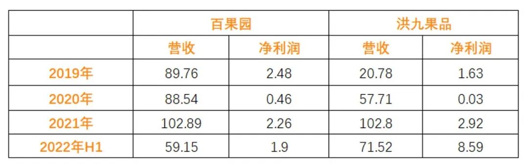 财报显示,2021年,百果园和洪九果品的营收都突破百亿元,分别达到102.89 亿元、102.80亿,同比增速分别为16.21%、78.12%。2022年上半年,二者营收继续增长7.1%、32.03%至59.15亿元、71.52亿元。