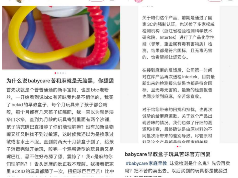 例如在小红书平台,关于Babycare部分玩具品尝起来口味发苦的分享贴一度引发了母婴消费群体的关注。