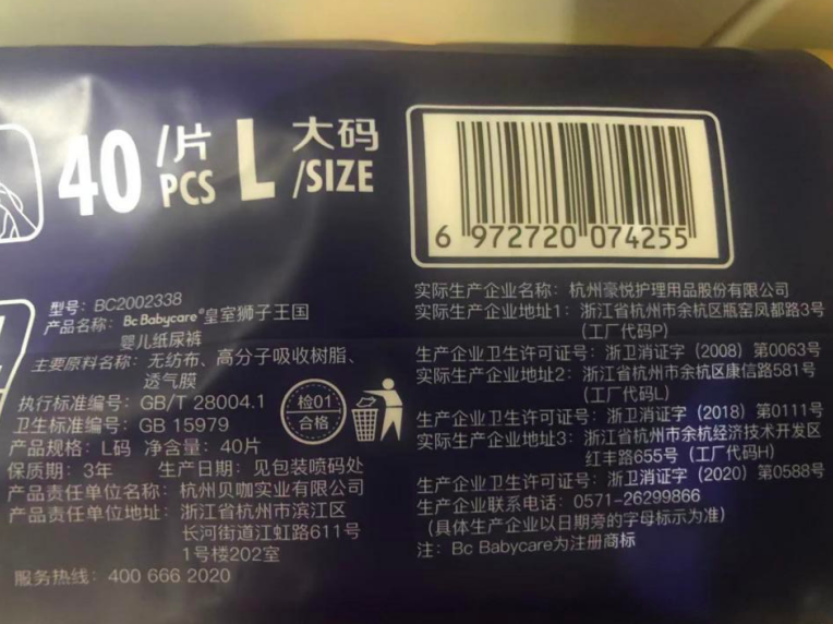以皇室纸尿裤为例,其产品包装上生产企业名称为杭州豪悦护理用品股份有限公司(下称“豪悦护理”)。后者于2020年上市,是国内头部卫生用品生产公司,主营婴儿纸尿裤、卫生巾和成人纸尿裤等。