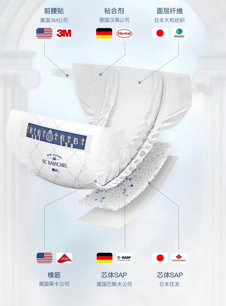 例如在官方口径中,Babycare爆款皇室纸尿裤采用了“3国六企”材质——面层纤维来自日本大和纺织、芯体SAP选自德国巴斯夫公司......