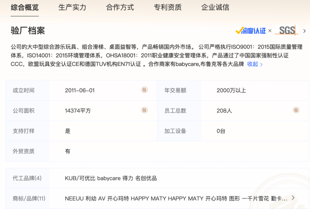 在纸尿裤之外,Babycare的休闲玩具则由利幼实业有限公司代工,在1688平台,利幼实业不仅是被认证的超级工厂,也在合作客户中披露了Babycare等公司。