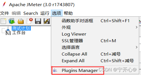 启动jemter,点击选项,最下面的一栏,如下图所示: