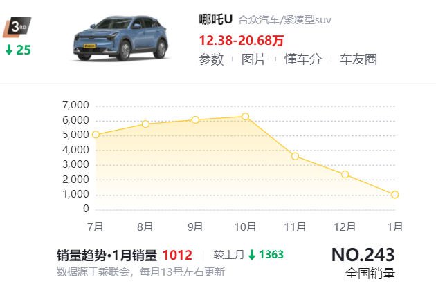 中端车型哪吒U是哪吒推出的第二款车,属于A级SUV,这是当下新能源市场增长最快的细分市场。但市场的繁荣成就了宋plus和埃安Y,却没有成就哪吒。在2021年达到月销过万的巅峰后,哪吒S在2022年却“逆势衰退”,销量同比下滑了21%。最近几个月更是大幅波动,频频出现下滑。今年1月,哪吒U销量仅为1012台,环比下滑79.65%,12月也仅销售了2375台,环比下滑31.55%。