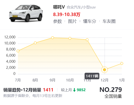本次暴跌的罪魁祸首是哪吒旗下最便宜的走量车哪吒V:1月销量仅为3487辆,同比下滑46.2%。1月是汽车的传统淡季,销量不佳情有可原。但自2022年9月、10月连续销量破万后,哪吒V已经连续三个月销量下滑。其中,12月的下滑幅度最大,仅卖出了1411辆,环比下降了1万台。