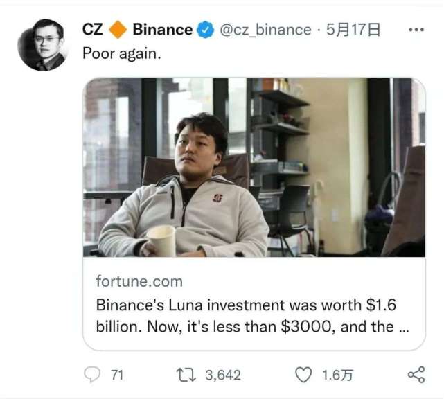 “返贫了(Poor again)。”5月17日,币安创始人赵长鹏转载了一条有关币安投资Luna币的报道并评论道。