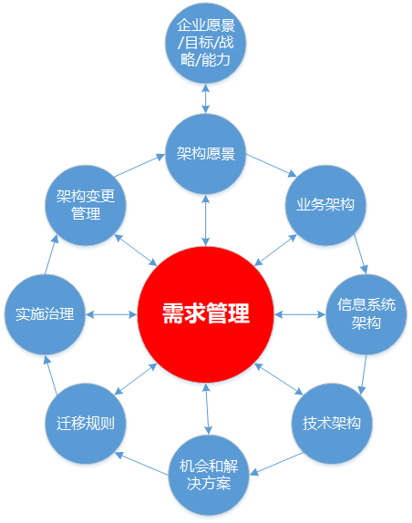 TOGAF ADM由架构愿景、业务架构、信息系统架构、技术架构、机会和解决方案、迁移规则、实施治理、架构变更管理组成,形成一套统一连续的Enterprise Architecture 工具集。有些书箱会把业务架构合并到信息系统架构中,业务架构上承企业战略,下启信息系统架构,同时需要确保业务架构和IT落地保持一致,业务架构独立更能起到应有的作用。 这张图的核心是企业一切活动、设计均指向需求管理,一切都需要服务好业务,业务第一原则。