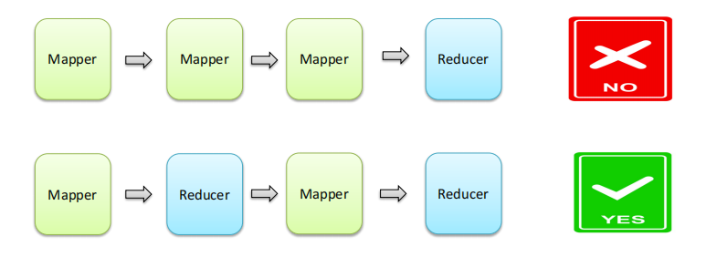 ⚫ 不能有诸如多个map阶段、多个reduce阶段的情景出现;