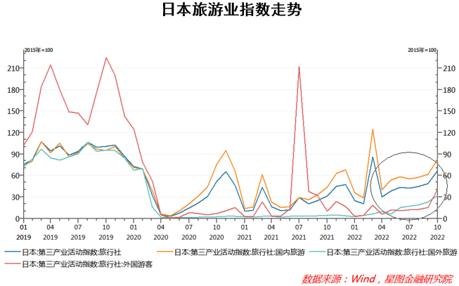 与此同时,日本旅游出行也在全面放开后逐渐恢复,其产业活动指数亦是高于2021年同期。不过需要注意的是,日本国内旅游复苏力度要明显强于国外旅游,反映出即便是放开管控,日本民众依然更倾向于在境内出游。