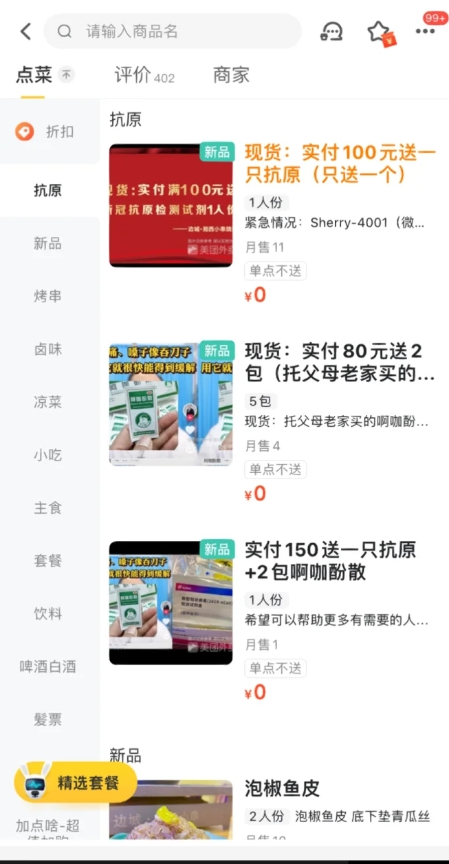 除此之外,还有部分商家,将抗原用在了招揽生意方面。比如,在佛山开SPA馆的戴老板,就在网上发文表示:“成为SPA馆会员后,在每月的会员日到店,可免费领取抗原试纸。”同时,还有餐饮商家,在美团外卖上打出广告:“实付满100元,送抗原一份。”