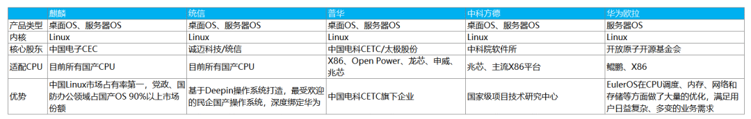 国产操作系统:比较成熟的厂商有麒麟、统信、普华、中科红旗、中科方德、中兴新支点、普华软件、凝思软件、中标软件。麒麟领先,麒麟和统信为代表,对标Windows、Redhat,相比windows系统差距还很大。