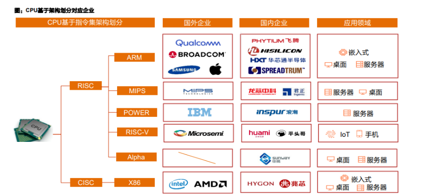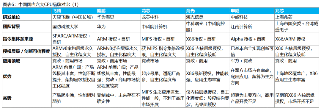 中国信创名录厂商:鲲鹏(未上市)、海光(已上市)、飞腾、龙芯、申威、兆芯(未上市)等代表中国最强的CPU芯片,对比海外Intel、AMD等。