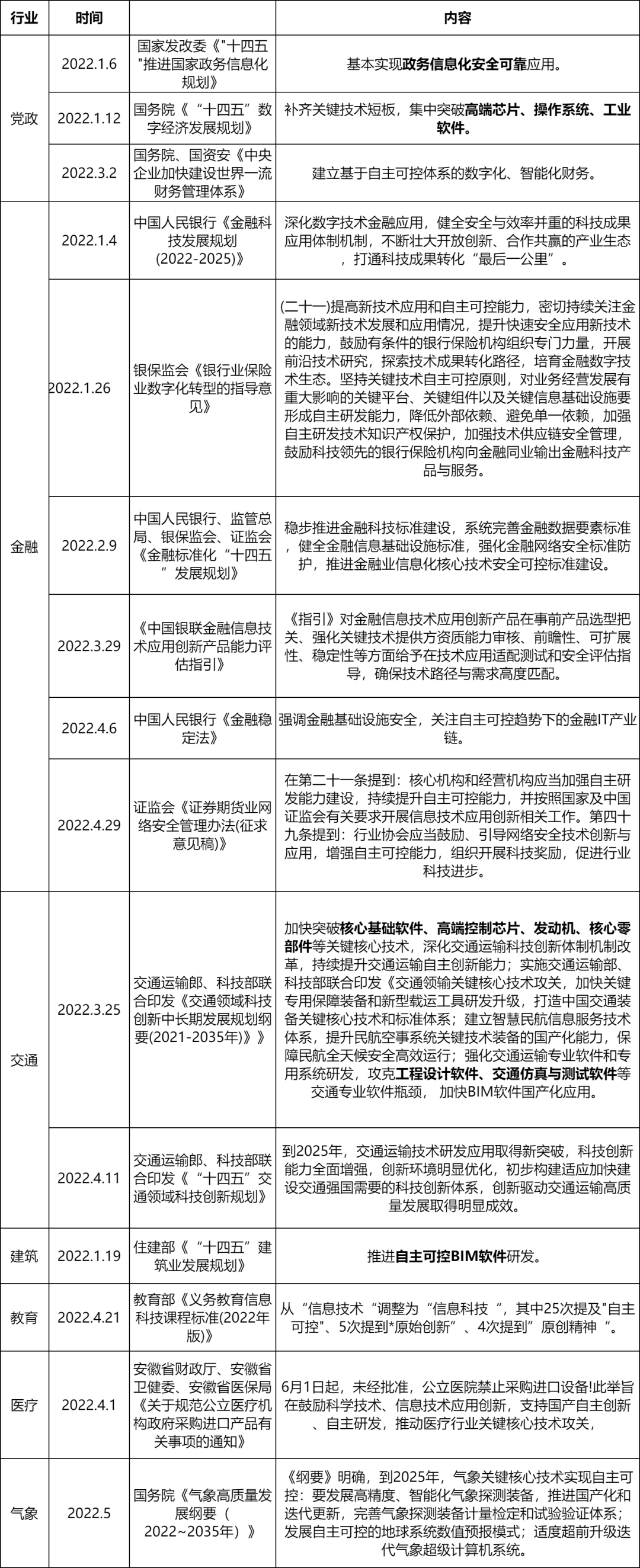 金融:对业务经营发展有重大影响的关键平台、关键组件以及关键信息基础设施要形成自主研发能力、降低外部依赖、避免单一依赖;强化金融网络安全;关注自主可控趋势下的金融IT产业链;