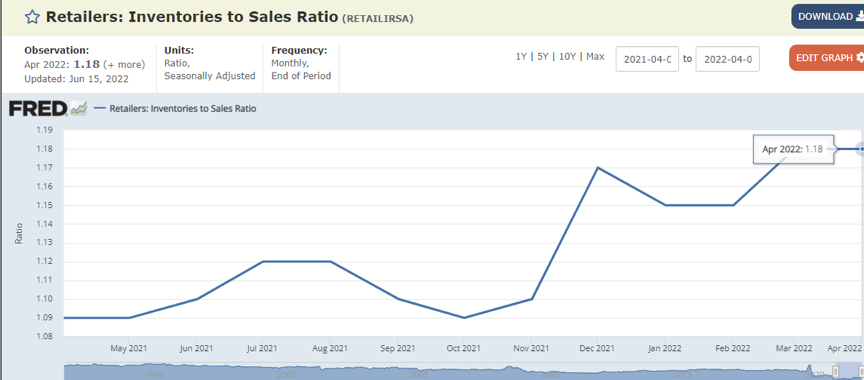 毫无疑问的是,今年以来零售销售逐步走弱。圣路易斯联储银行FRED数据表明自2021年9月起,零售商库存额在逐月升高,在今年4月达到自1992年以来的历史最高水平。