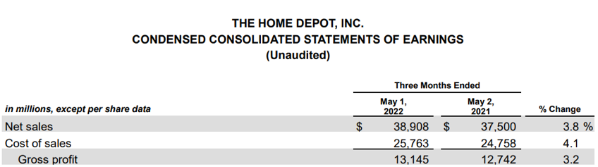 图/截至2022年5月1日,家得宝2022年第一季度财报,利润表