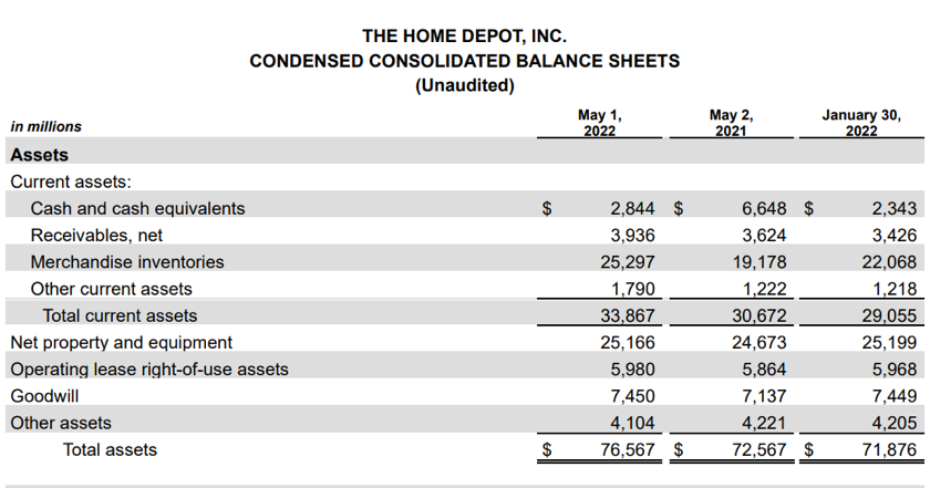 图/截至2022年5月1日,家得宝2022年第一季度财报,简明资产负债表