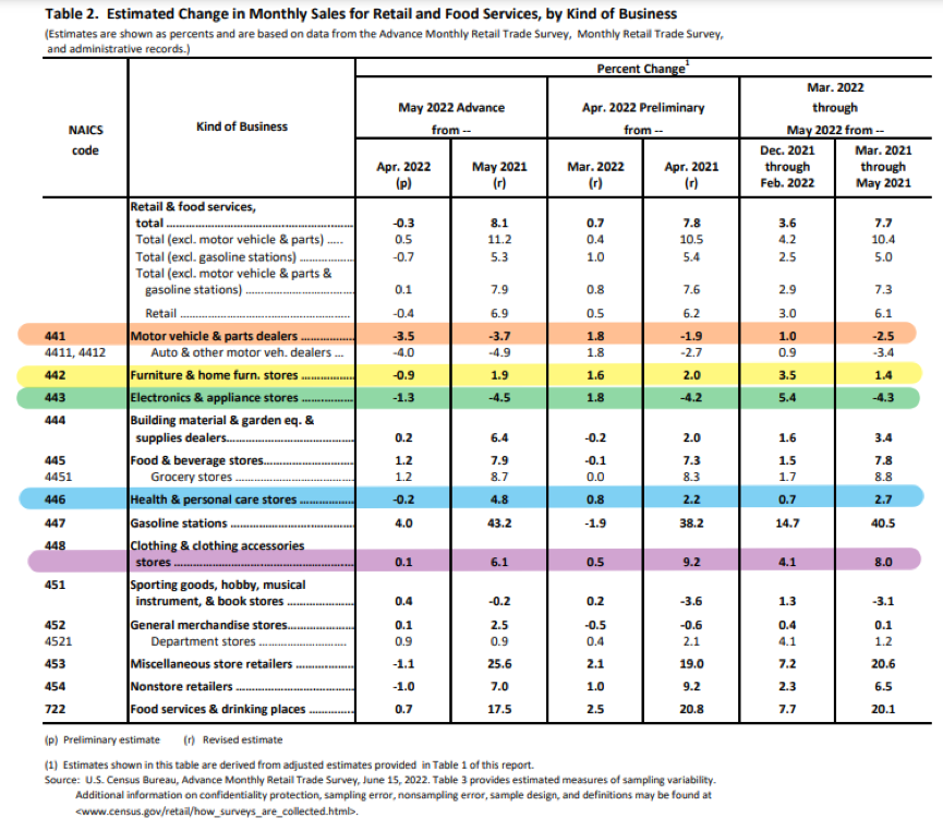 请输入图/美国人口普查局于2022年6月15日发布《2022年5 月零售贸易和食品服务月度预销售额报告》节选图说