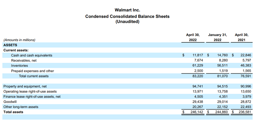 图/截至2022年4月30日,沃尔玛2022年第一季度财报,简明资产负债表