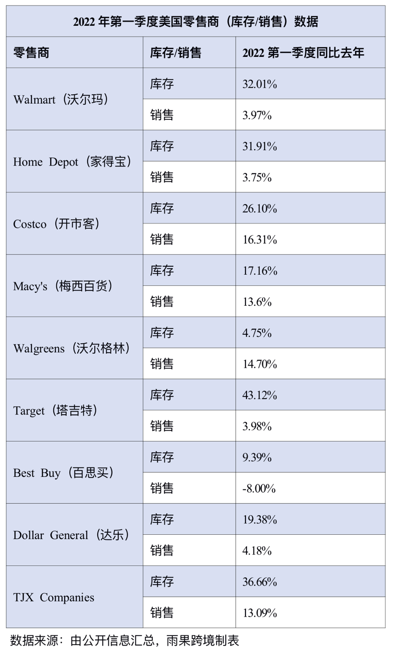 透过下图2022年第一季度美国零售巨头在库存、销售两项关键数据,不难看出美国零售业正处在供需错位的尴尬处境。