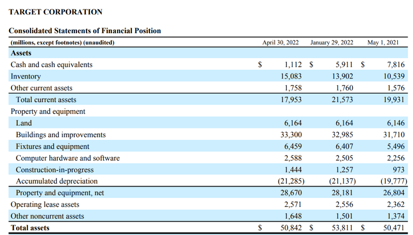 图/截至2022年4月30日,塔吉特2022年第一季度财报,简明资产负债表