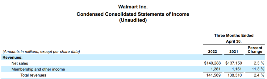 图/截至2022年4月30日,沃尔玛2022年第一季度财报,利润表