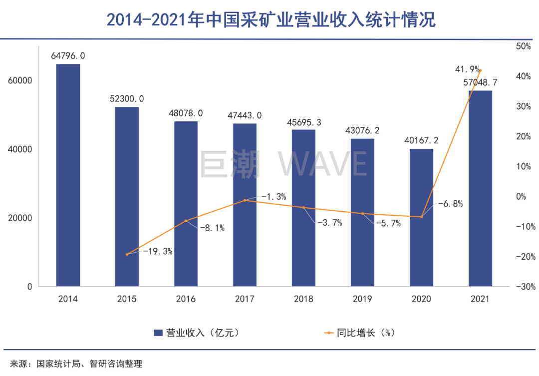 我国采矿业也在多年下行之后,在2021年迎来触底大反弹。2021年中国采矿业主营业务收入57048.7亿元,同比增长41.9%。其中,煤炭开采和洗选业实现主营业务收入32896.6亿元,同比增长58.3%;石油和天然气开采业为9112.3亿元,同比增长35.9%;黑色金属矿采选业为5820.7亿元,同比增长34.3%;有色金属矿采3093.6亿元,同比增长14.8%。