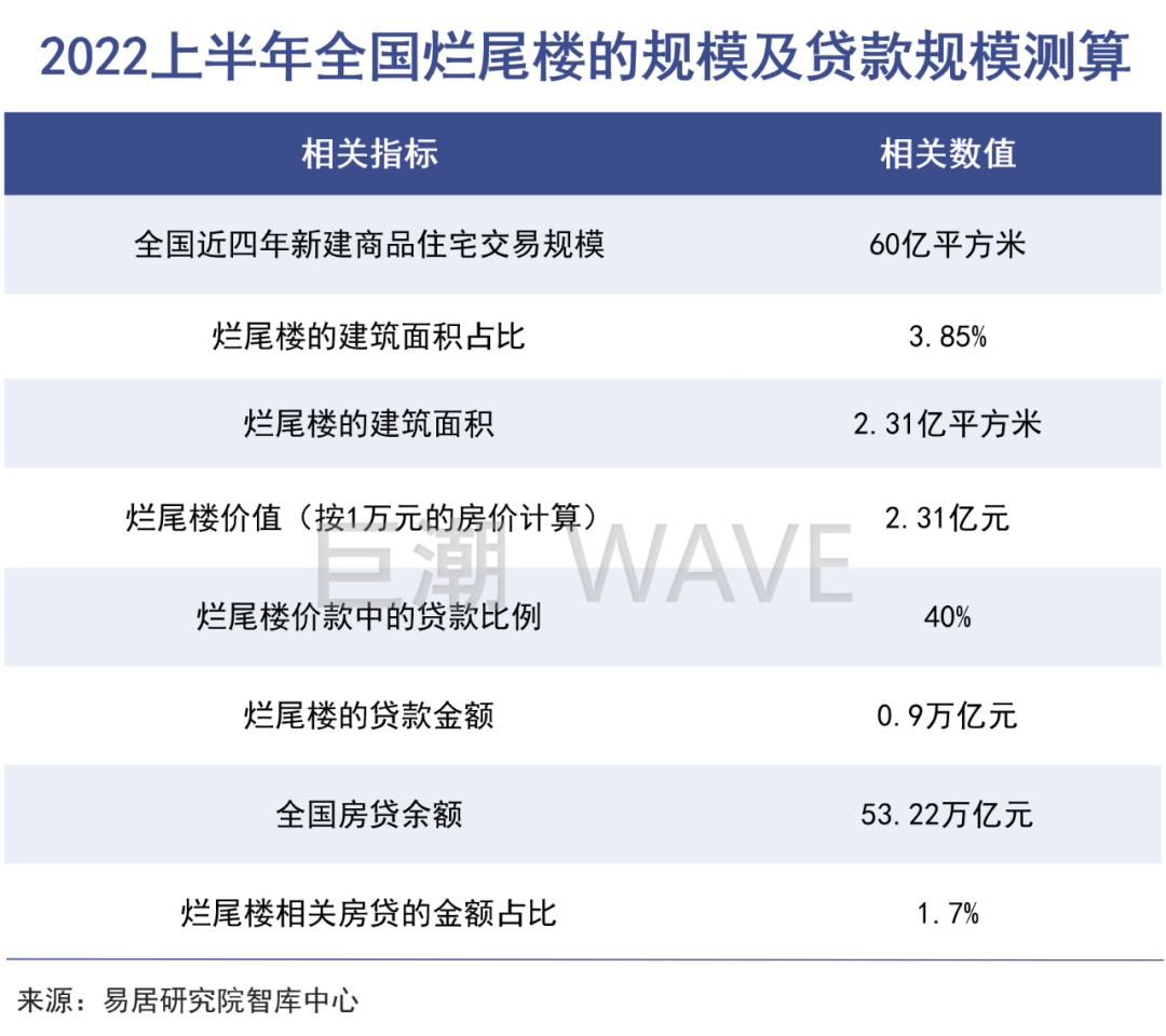 根据易居研究院智库中心发布了《2022年全国烂尾楼研究报告》显示,2022年上半年,全国重点50城的烂尾楼建筑面积为7151万平方米,烂尾率为5%。如果按照全国住房市场烂尾率为3.85%来计算,2022年上半年对应的烂尾楼面积为2.31亿平方米。