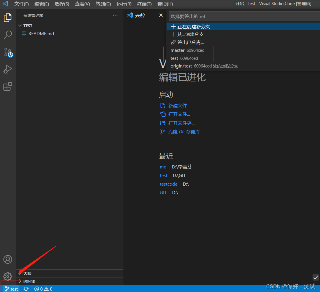 - 打开VScode软件,我们可以通过左下角进行git分支的切换。