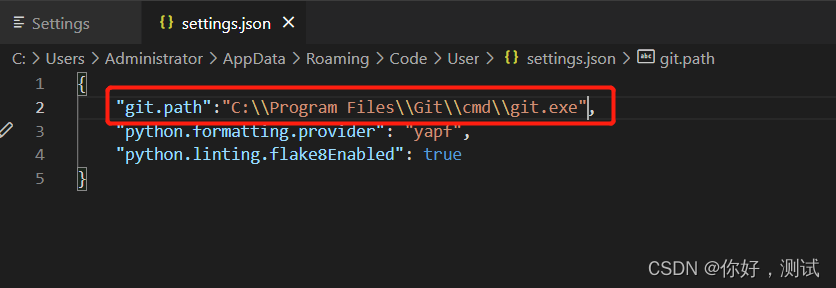 选中文件–>首选项–>设置,搜索git,在setting.json中添加"git.path":“D:/soft/git/Git/bin/git.exe”