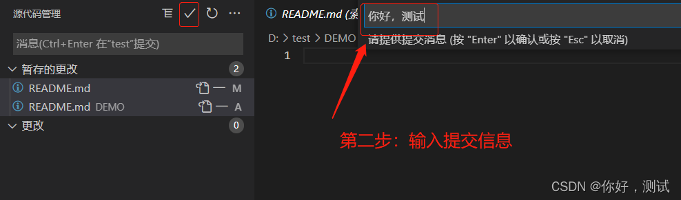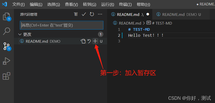 第一步是暂存文件。 第二步是输入提交信息。 第三步然后使用状态栏的提交按钮提交全部更改。