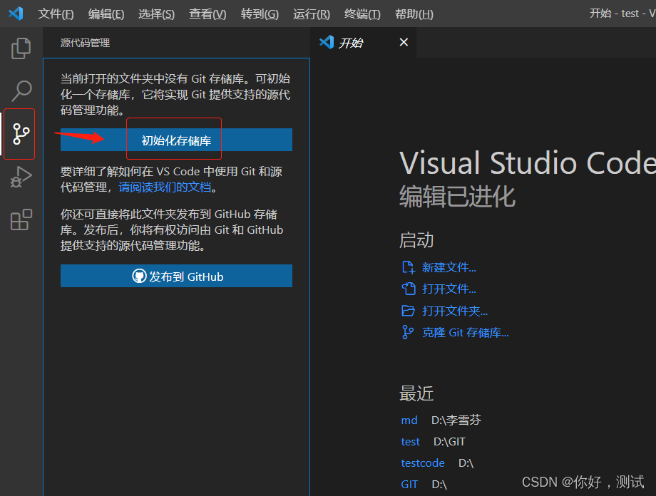- 打开后,切换至源代码管理,点击:初始化存储库,初始化自己的本地代码仓库。