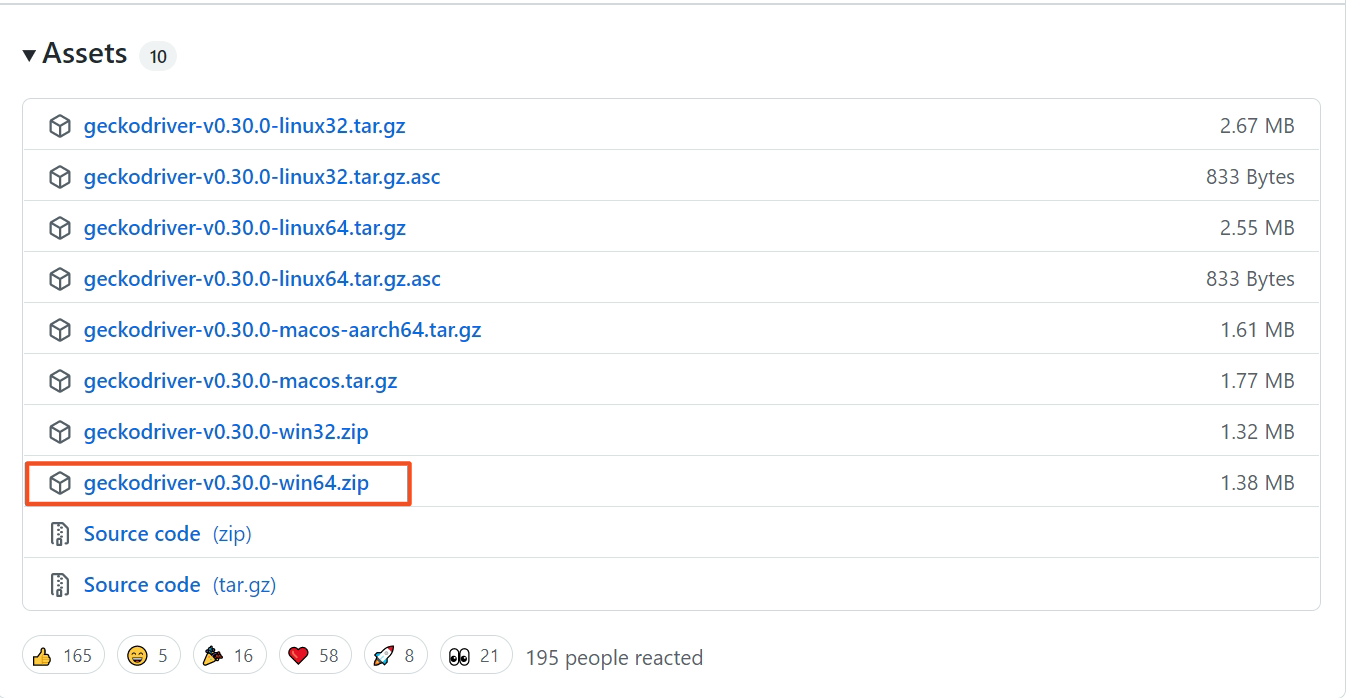 Firefox驱动下载地址:https://github.com/mozilla/geckodriver/releases/(此地址为最新版驱动)