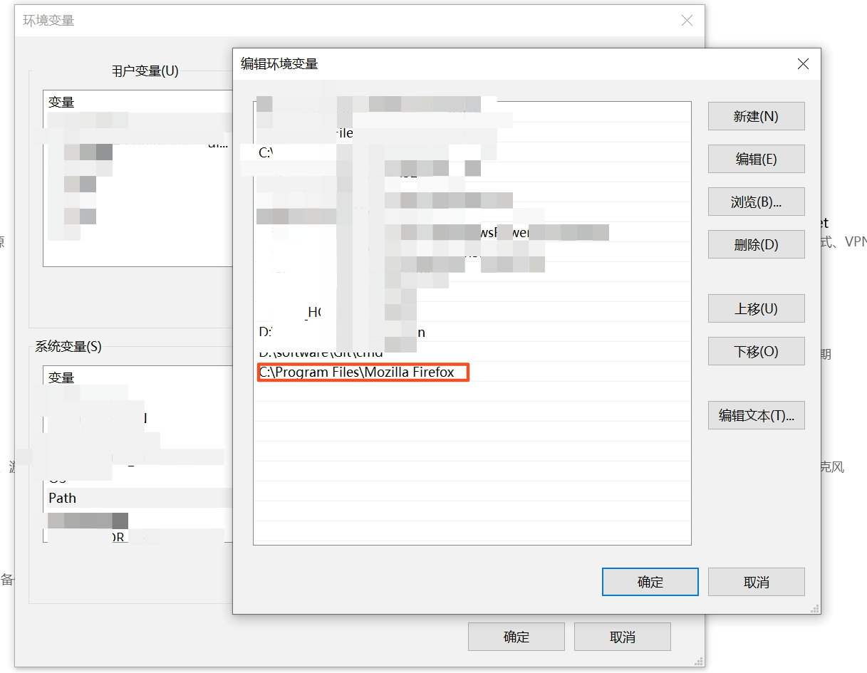 b.在PATH路径加:C:\Program Files\Mozilla Firefox