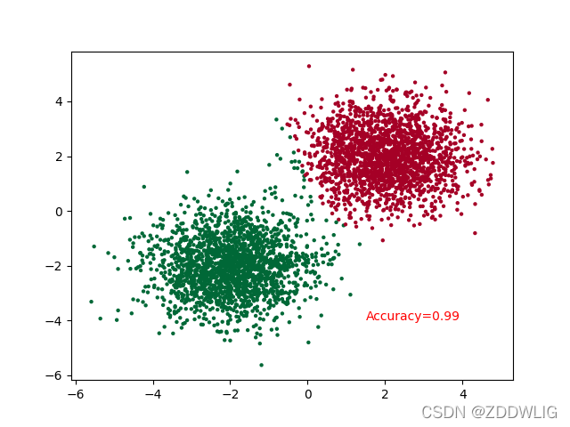 主体部分和回归没有什么区别,只是需要修改几个小部分就行了:因为我们的点是二维数据所以输入层有两个神经元,最终结果也是二维数据所以输出层也有两个神经元,损失函数我们选取交叉熵(CrossEntropy)。