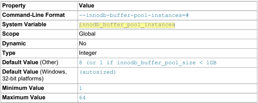 The number of regions that the InnoDB buffer pool is divided into. For systems with buffer pools in the multi-gigabyte range, dividing the buffer pool into separate instances can improve concurrency,by reducing contention as different threads read and write to cached pages. Each page that is stored in or read from the buffer pool is assigned to one of the buffer pool instances randomly, using a hashing function. Each buffer pool manages its own free lists, flush lists, LRUs, and all other data structures connected to a buffer pool, and is protected by its own buffer pool mutex.
