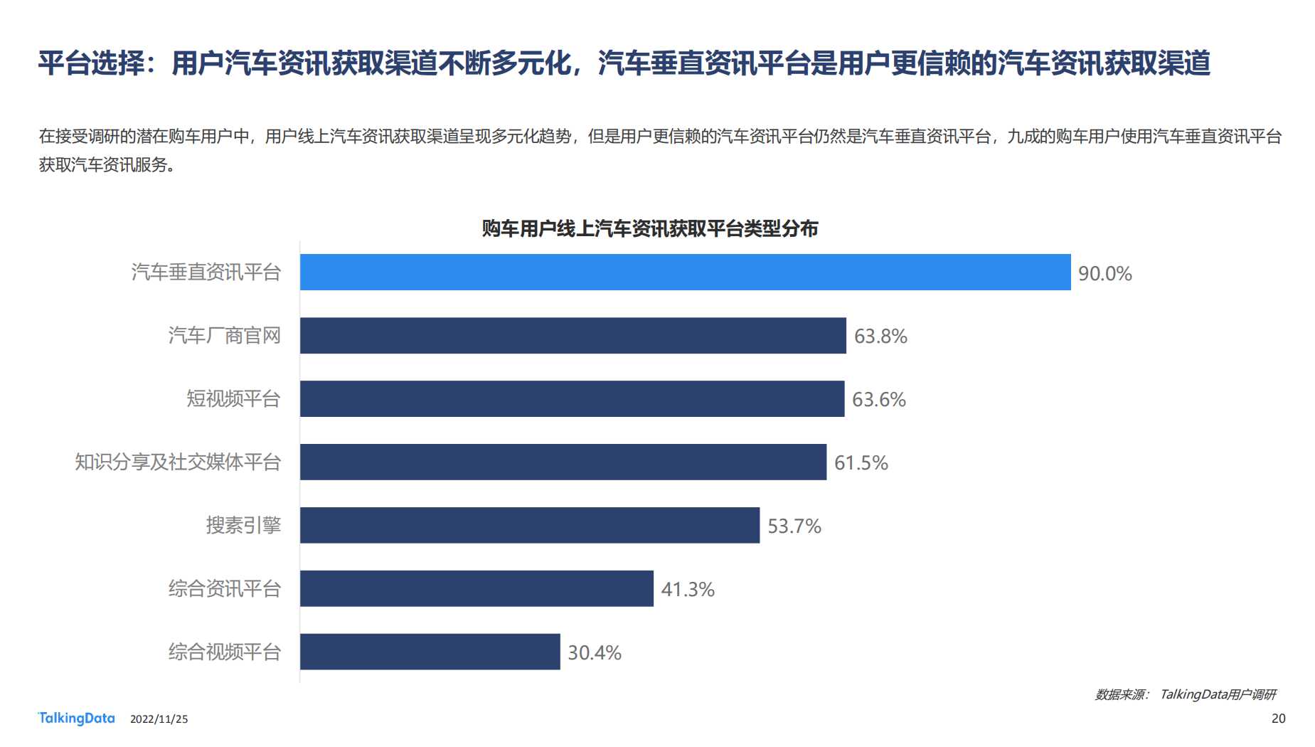 11月25日,知名数据服务提供商TalkingData发布《2022年汽车垂直资讯渠道价值洞察报告》。报告系统梳理和分析了中国汽车消费及用户资讯获取方式、汽车资讯分发渠道价值及竞争格局、汽车垂直资讯平台发展趋势,以呈现汽车垂直资讯渠道价值,发掘汽车行业数字化转型新机遇,为车企及经销商的媒体投放及营销数字化转型提供了重要参考。