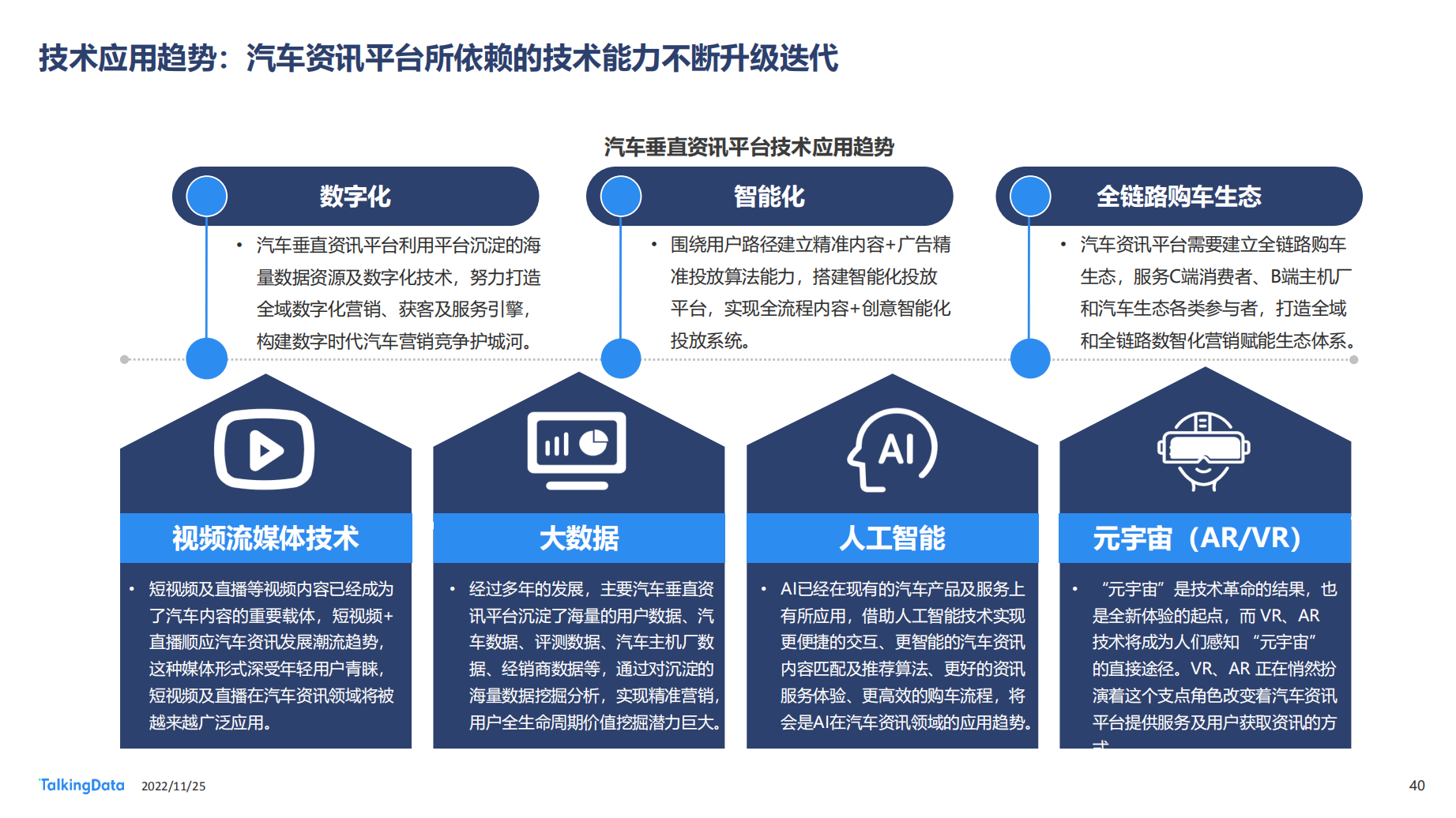 此外,报告还分析了汽车垂直资讯平台技术应用趋势,指出数字化、智能化与全链路购车生态是大趋势。同时,视频流媒体技术、大数据、人工智能、元宇宙(AR/VR)也是进一步迭代升级的新方向。