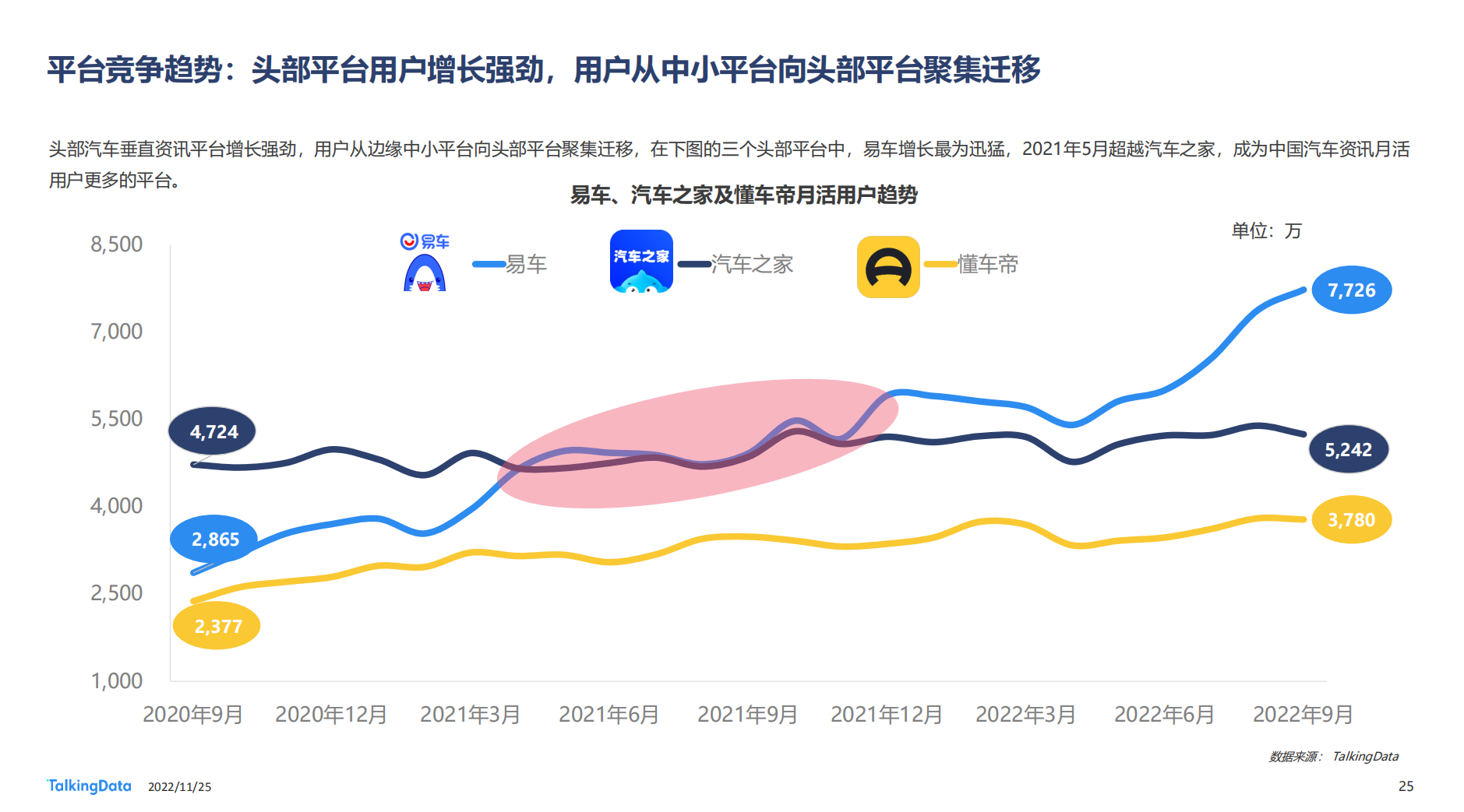 同时,行业呈现中心化趋势,用户从中小平台向头部平台迁移。在前三大头部平台中,易车增长最为迅猛,2021年5月超越汽车之家,到2022年9月时月活用户量已达7726万。