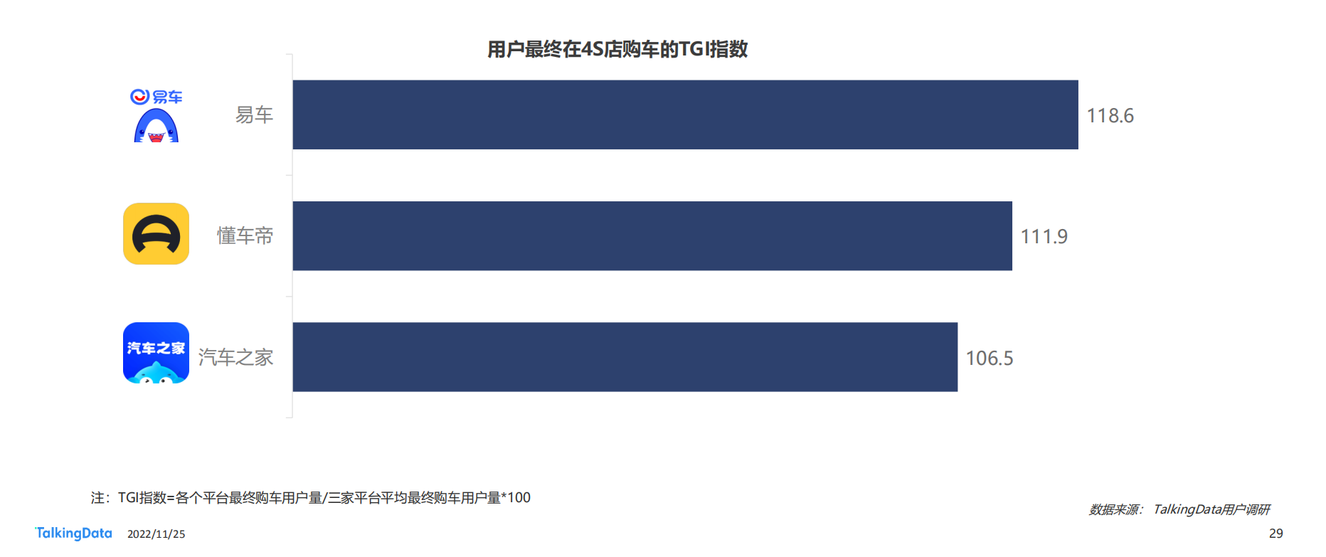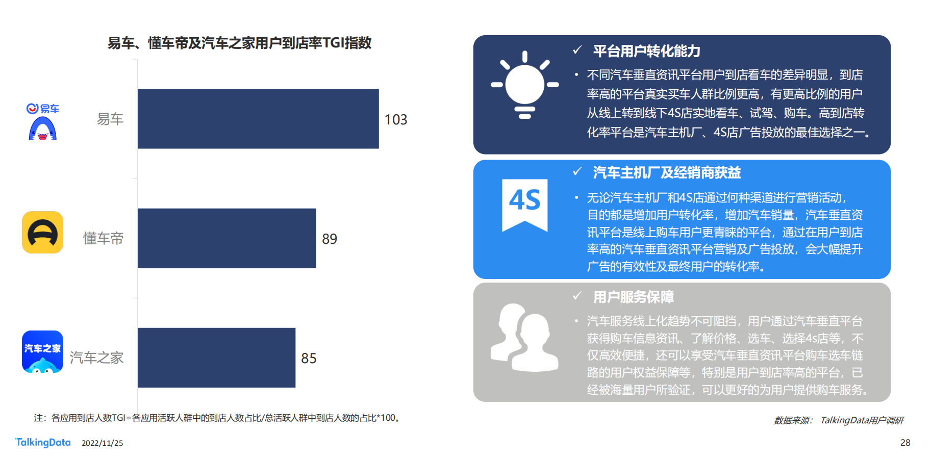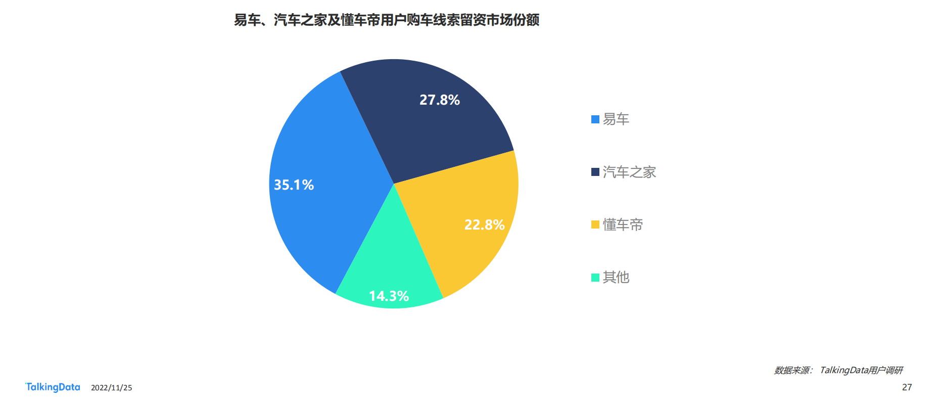 这样的马太效应还体现在平台用户吸附能力、用户购车留资、用户线下看车、购车转化等方方面面,根据TalkingData调研发现,易车较另两家头部平台具有较为显著的优势。
