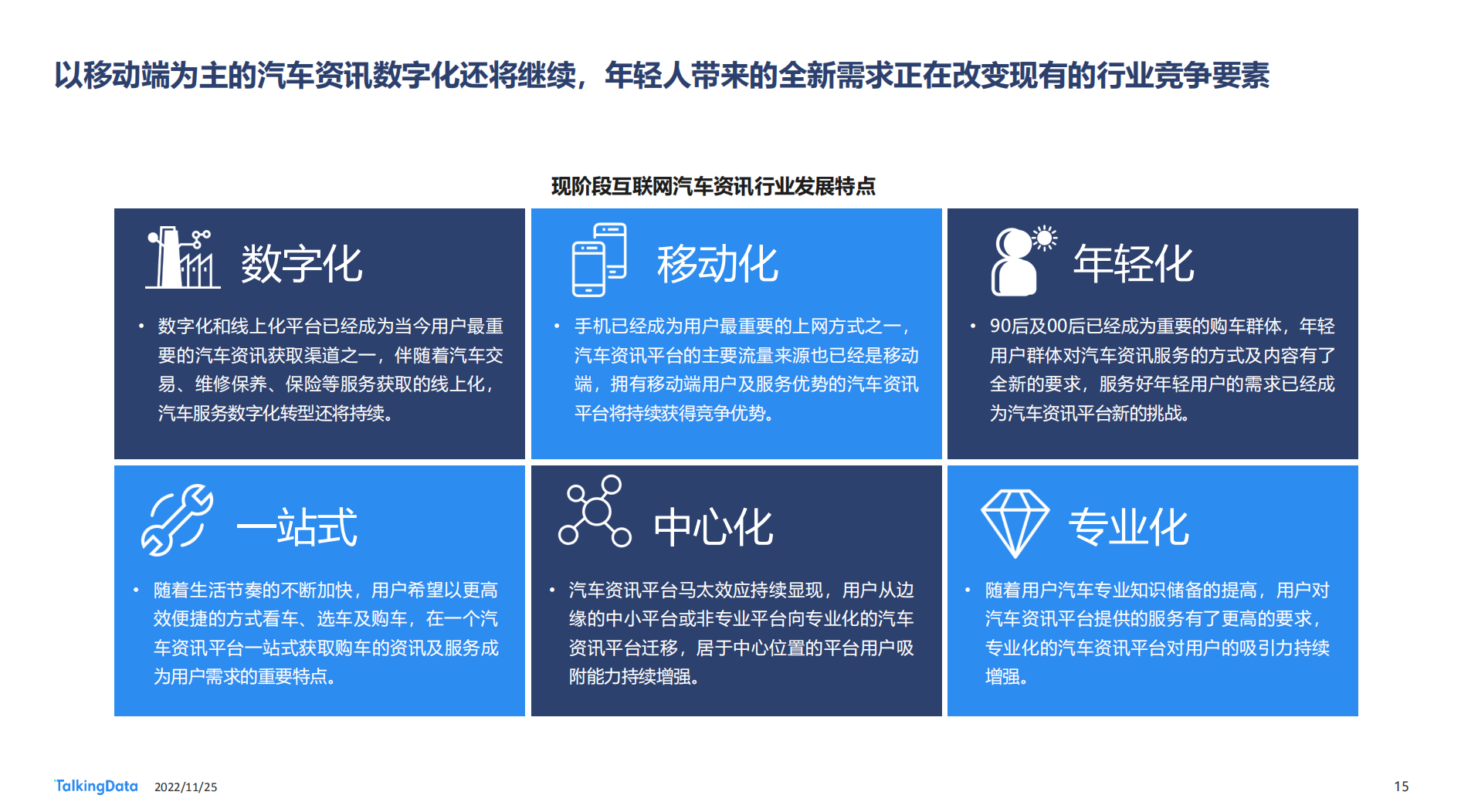 报告指出,以移动端为主的汽车资讯数字化还将继续,年轻人带来的全新需求正在改变现有的行业竞争要素。在这样的背景下,现阶段互联网汽车资讯行业,也呈现出数字化、移动化、年轻化、一站式、中心化、专业化的发展特点。