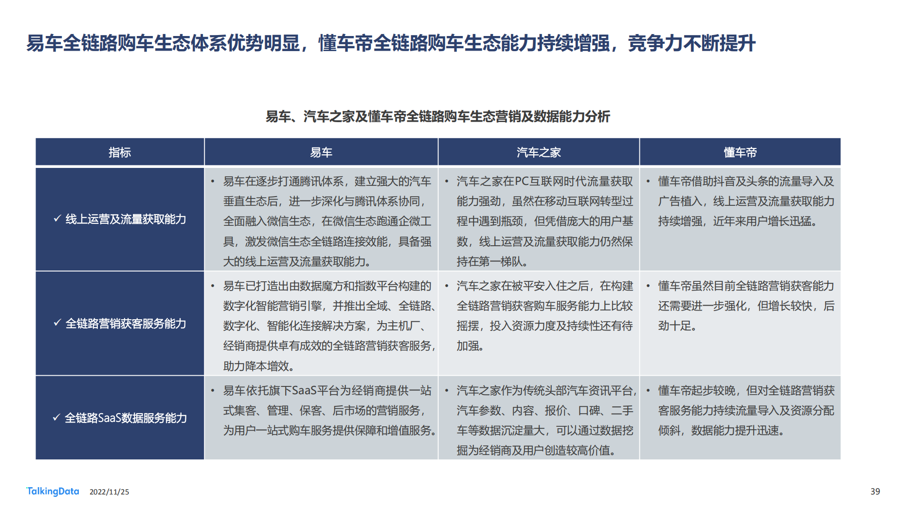报告还对比分析了易车、汽车之家及懂车帝三大汽车垂直平台购车服务生态建设,以及全链路购车生态营销及数据能力,认为易车全链路购车生态体系优势明显,懂车帝全链路购车生态能力持续增强,竞争力不断提升。