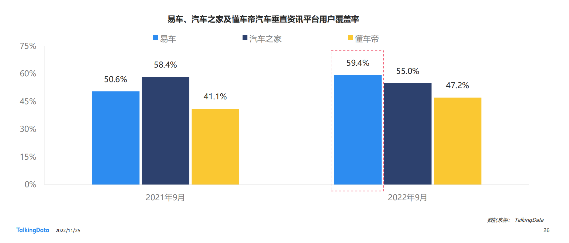 在汽车垂直资讯行业,头部平台用户吸附能力持续增强,用户覆盖率大幅提升,中小汽车资讯平台用户向头部平台迁移。其中易车用户覆盖率从2021年9月的50.6%,提高到2022年9月的59.4%。