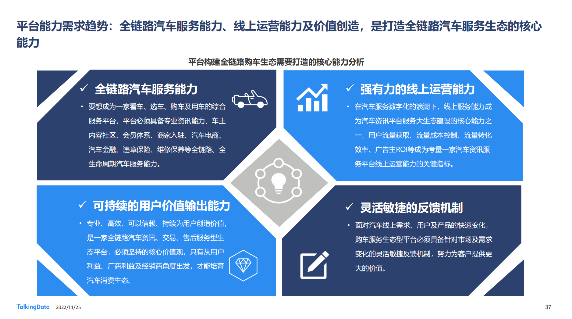 而这也对汽车资讯平台的能力建设也提出了新的要求——全链路汽车服务能力、强有力的线上运营能力、可持续的用户价值输出能力和灵活敏捷的反馈机制。
