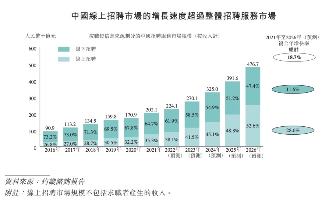 首先,BOSS直聘提供线上招聘服务。根据CIC(灼识咨询)报告,中国线上招聘市场的规模按收入计预计将由2021年的714亿元增加至2026年的2508亿元,2021年至2026年的复合年增长率为28.6%。