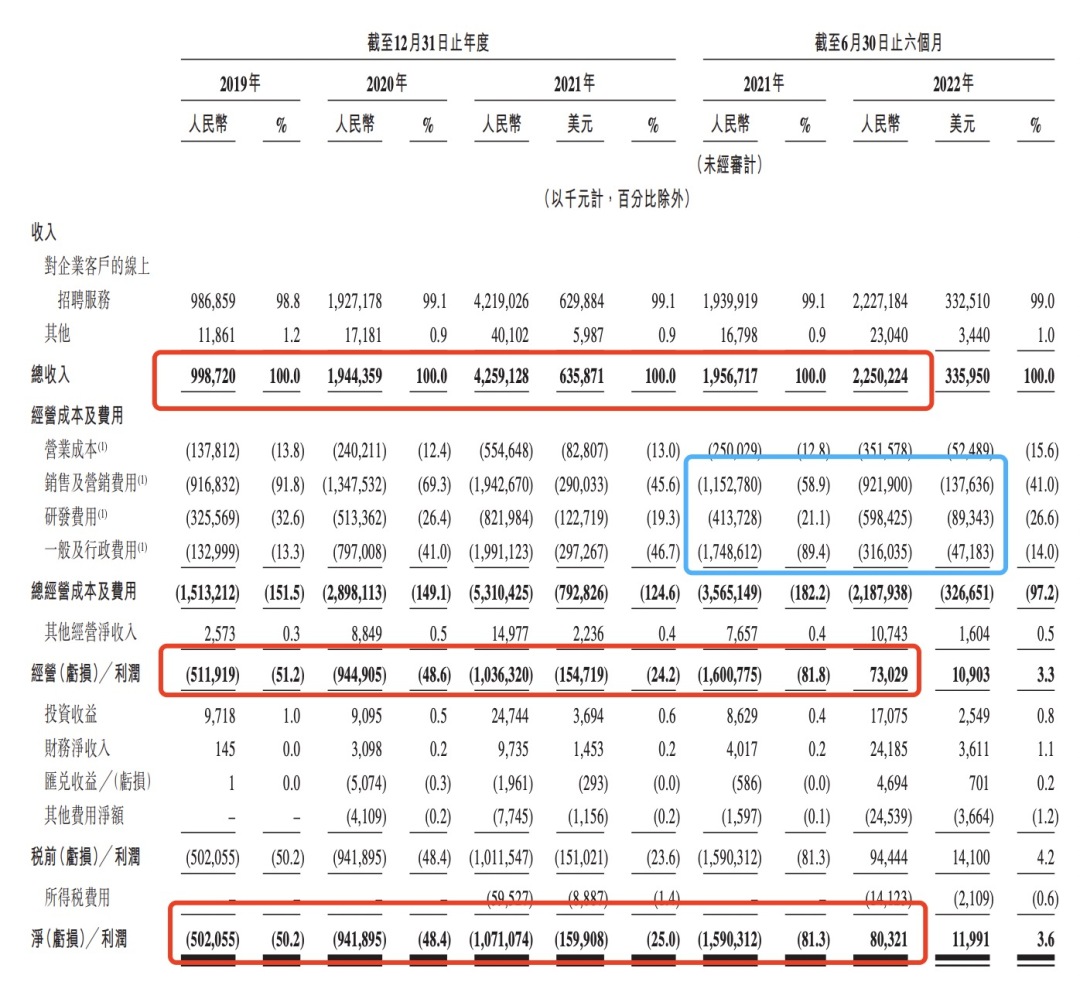 BOSS直聘在招股书中披露,由于经营成本及费用因销售及营销费用及一般行政费用增加导致公司2019年、2020年及2021年产生了净亏损。